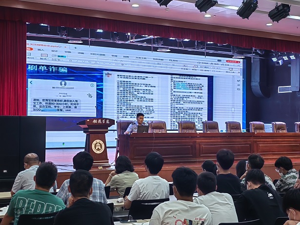讲座中,应邀警官从目前有代表性的网络安全大事件入手,介绍网络安全的重要性和复杂性。再针对个人信息安全,以三个生动有趣的短视频展现了如刷单、裸聊、借钱等大学生常常遇到的诈骗手段。最后,还介绍了国家反诈中心APP。