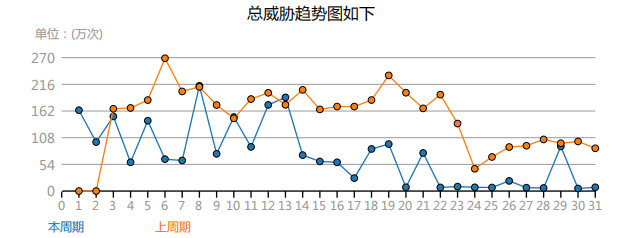 从2023-01-01至2023-02-28期间,设备处理的威胁总数为3882.75万次。其中,漏洞利用2.89万次,发现间谍软件287次,发现病毒38次(蠕虫木马,恶意链接等),命中威胁情报37.87 万次,命中威胁处置6.25 万次。在异常主机中,失陷主机152台。2023-01-08处理威胁数最多(共212.99万次)。与上周期统计比,2023-02-13处理威胁数变化最大(下降83.0%)。处理的威胁总数呈下降趋势。处理的威胁总数呈下降趋势。