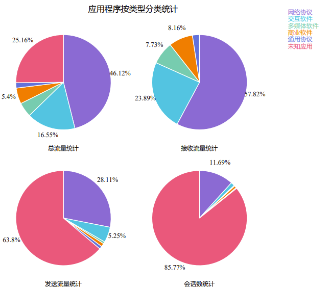 经应用程序汇总分析:HTTPS总流量最多,占比27.73%。HTTPS接收流量最多,占比43.47%。未知应用发送流量最多,占比66.28%。未知应用会话数最多,占比93.48%。未知应用总流量占比26.97%。其中,接收流量占比0.04%,发送流量占比66.28%,会话数占比93.48%。未知应用占比过大。