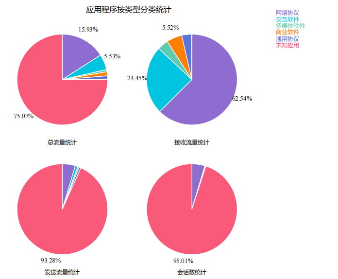 经应用程序汇总分析:未知应用总流量最多,占比77.42%。HTTPS接收流量最多,占比46.7%。未知应用发送流量最多,占比95.41%。未知应用会话数最多,占比98.11%。未知应用总流量占比77.42%。其中,接收流量占比0.1%,发送流量占比95.41%,会话数占比98.11%。